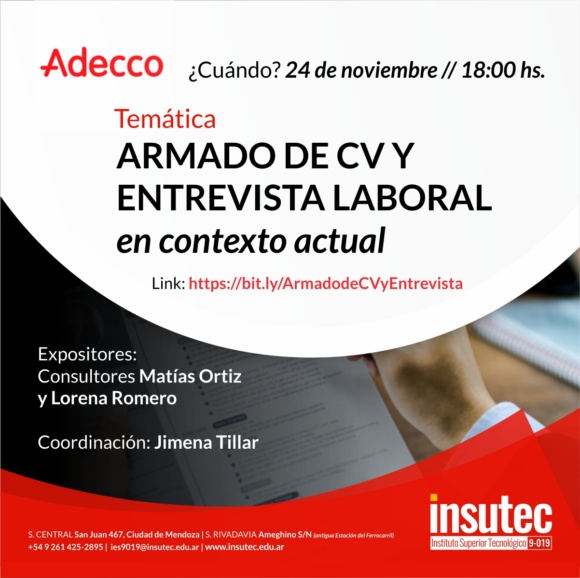 Leer másiATENCIÓN ALUMNOS! La Comunidad Educativa del INSUTEC en conjunto con Adecco, les acercan la capacitación: Temática: ARMADO DE CV Y