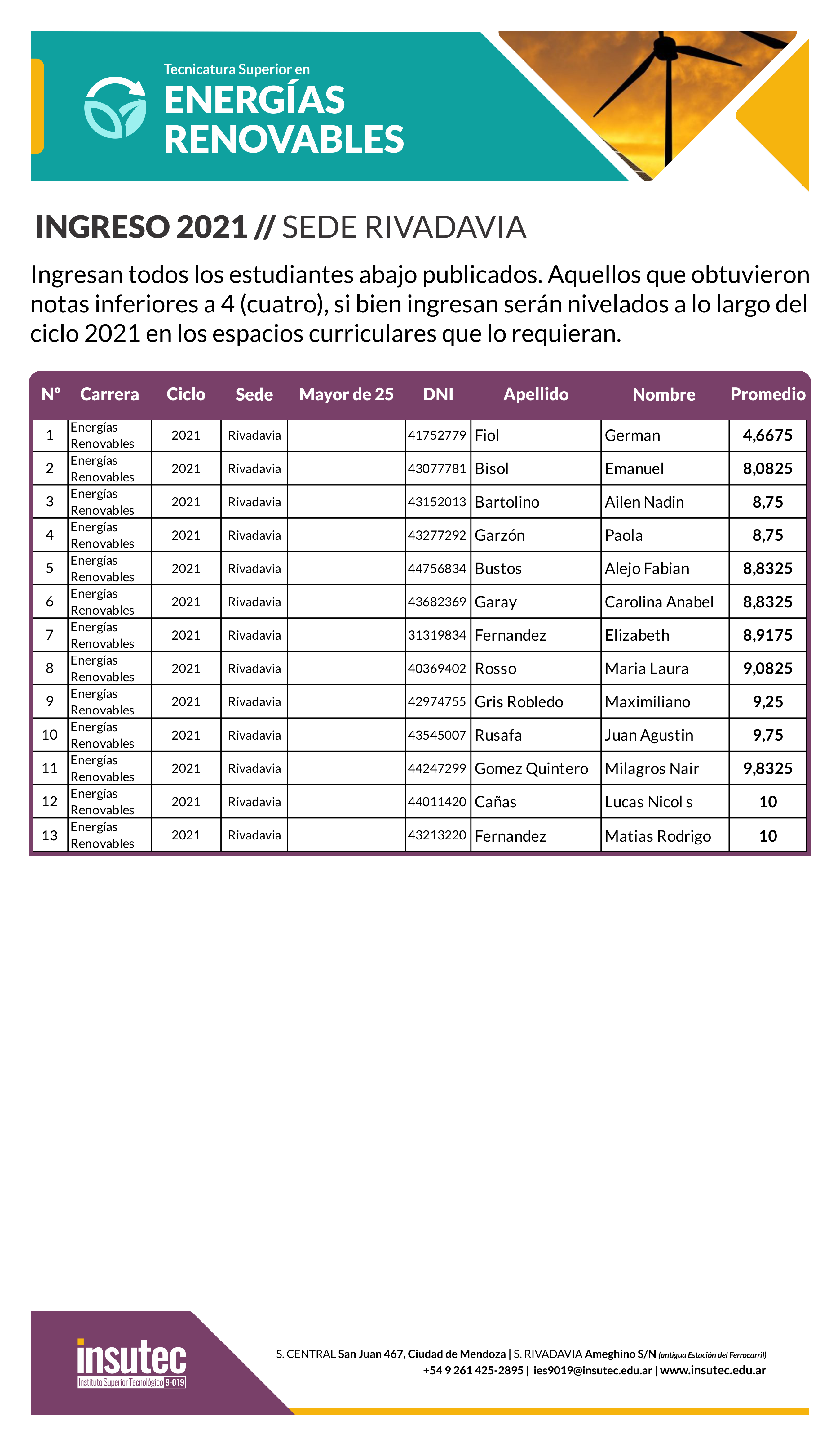 Noticias INGRESO 2021 TECNICATURA SUPERIOR EN ENERGÍAS RENOVABLES 1 abril, 2021 Administrador General INGRESO 2021 // SEDE RIVADAVIA Ingresan todos los estudiantes abajo publicados. Aquellos que obtuvieron notas inferiores a 4 (cuatro), si bien ingresan serán nivelados a lo largo del ciclo 2021 en los espacios curriculares que lo requieran.