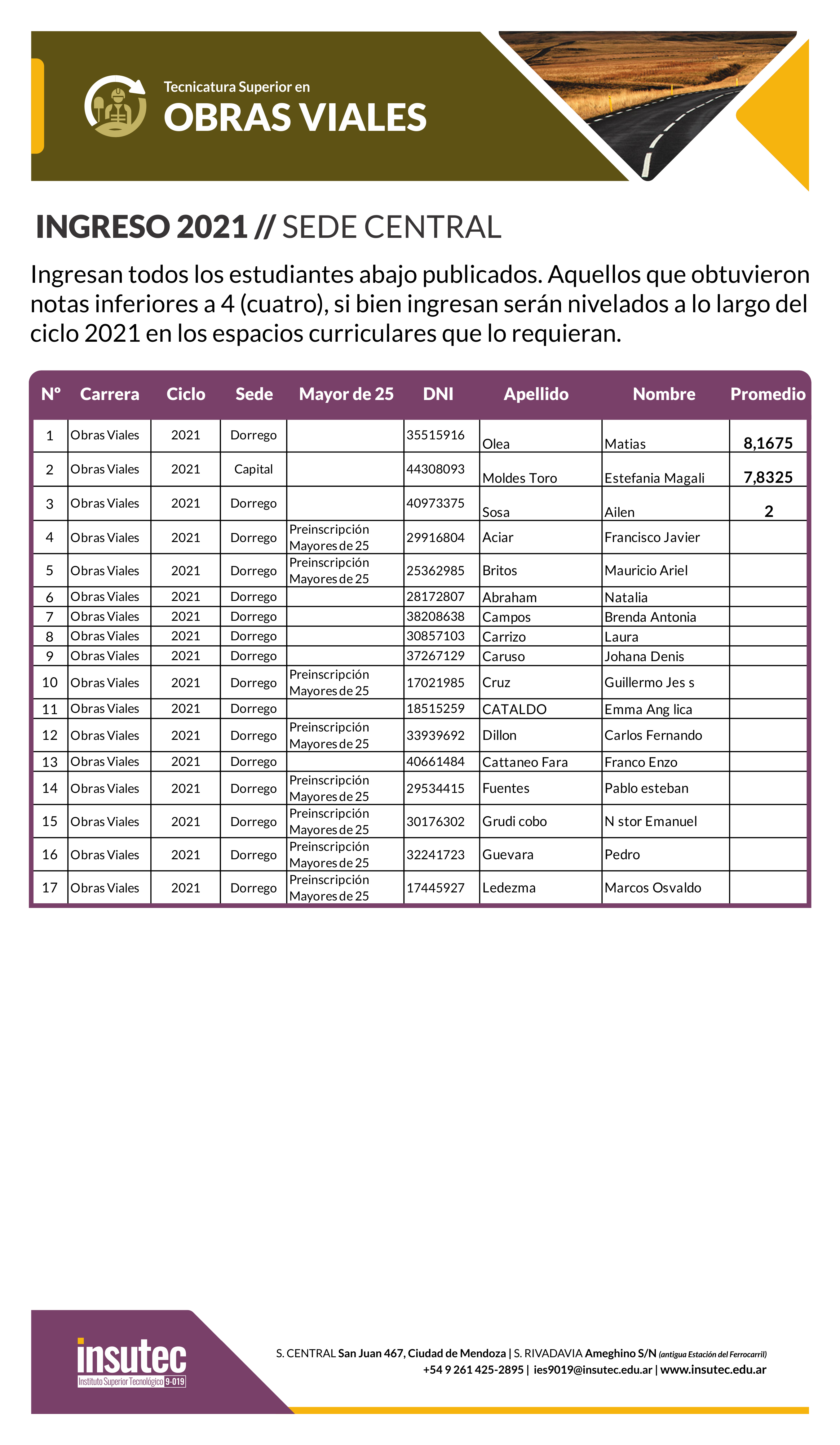 Noticias INGRESO 2021 TECNICATURA SUPERIOR EN OBRAS VIALES 1 abril, 2021 Administrador General INGRESO 2021 // SEDE CENTRAL Ingresan todos los estudiantes abajo publicados. Aquellos que obtuvieron notas inferiores a 4 (cuatro), si bien ingresan serán nivelados a lo largo del ciclo 2021 en los espacios curriculares que lo requieran.