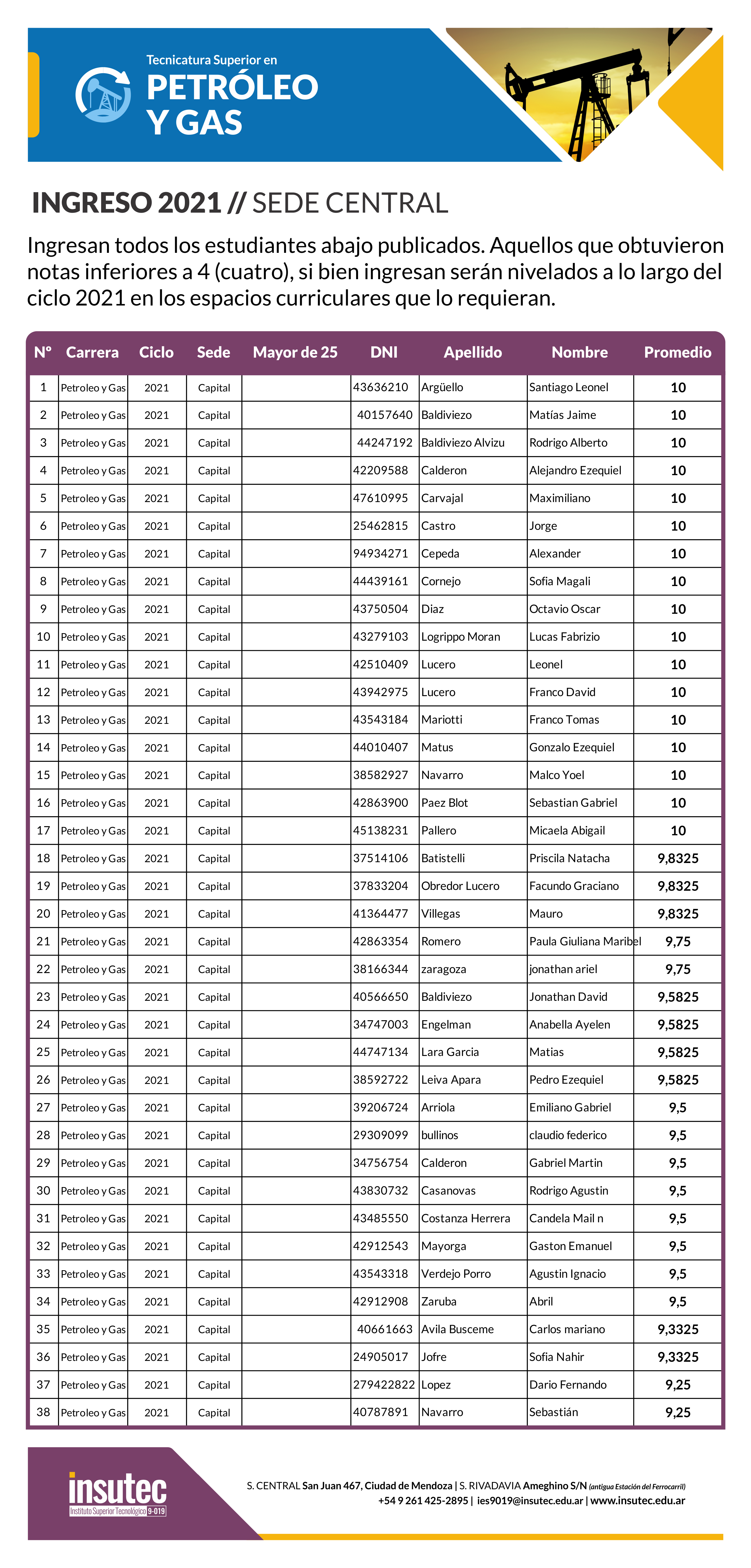 INGRESO 2021 TECNICATURA SUPERIOR EN PETRÓLEO Y GAS
